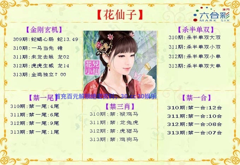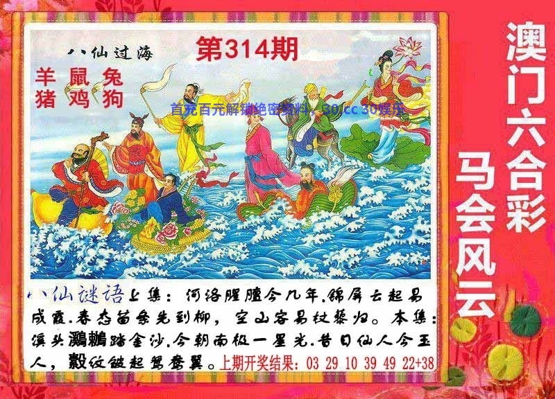 | 314期:【八仙过海】 【溪头鸂鶒踏金沙,今朝南极一星光,昔日仙人今玉人,毅纹钺起鸳鸯翼】 解:意思是金沙解出金肖猴鸡,南极解出南肖牛鸡蛇 生肖:羊牛蛇兔猪鸡 |