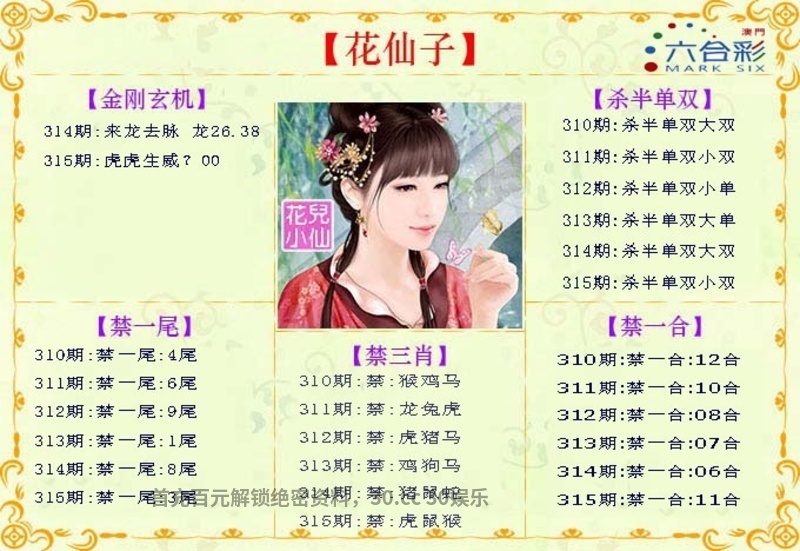 | 315期:【八仙过海】 【含娇含态情非一,人向万事凭双手,绣凤不教金缕暗,昨在七墨潭底见】 解:意思是万事解出大数25-49金缕解出金肖猴鸡,潭底解出水鼠猪 生肖:羊兔龙虎鼠鸡 |